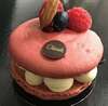 Macaron, crème mousseline parfumée à l'eau de rose, litchis et framboises